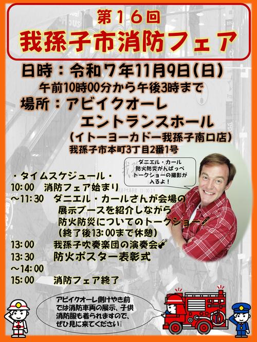 秋季全国火災予防運動期間中の事業として、我孫子市防災協会の主催による消防フェアも第16回を迎えました。例年通りの市内小・中学生の防火ポスター展示、表彰式及び我孫子吹奏楽団による生演奏を実施します。それに加え、山形弁で有名なダニエル・カールさんを招き防火防災についての楽しいトークショーを予定しています。