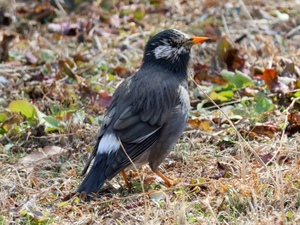 【解説】スズメ目ムクドリ科。全長24cm。全体的に灰褐色で、下腹部と腰は白く、尾は黒く先端に白斑が入る。頭部は黒く、頬や眼の前の白い模様は個体差が大きい。くちばしは黄色で目立つ。日本では留鳥で、平地から山地の市街地や農耕地、林や河原などに集団で生息する。樹上では木の実をつまんで食べ、地上ではくちばしを差し込んで地面を掘り、昆虫などを捕まえて食べる。手賀沼周辺では、公園や庭先の木の実を食べる様子や、草原や畑を歩いて地中のエサを探す様子、道路や駅前の街路樹で集団でねぐら入りする様子がよくみられる。