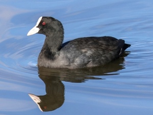 【解説】ツル目クイナ科。全長39cm。全身が灰黒色で、目は赤く、くちばしや目の上の額板(がくばん)が白い。日本では、東北地方北部以北で夏鳥、東北地方南部以南で留鳥または冬鳥。湖沼や河川、ハス田などに生息。足の指にある葉状の水かきで泳ぎ、水面や水中、陸上で水草や藻、昆虫などを食べる。手賀沼では一年中みられ、沼の水面を泳ぐ姿や、陸上で草を食べる様子がよくみられる。手賀沼を代表する鳥として、1988年に我孫子市の鳥に指定された。