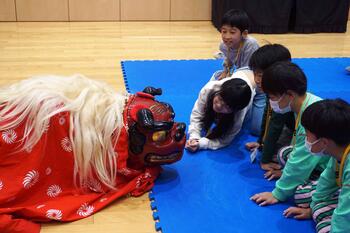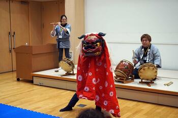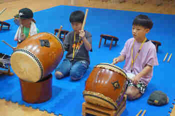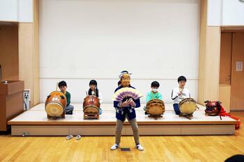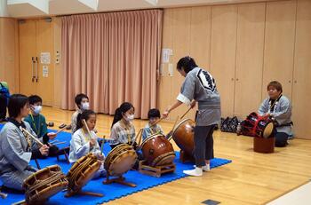 自由なリズムで太鼓を叩いてもらうリズム打ちの体験と、「仁羽」の文句『テケテン ツク ステスク テン ツクツ(締太鼓)』『ドーンドーン ドンドン(大太鼓)』にあわせて叩く練習行い、最後に笛と鐘に合わせて演奏しました。