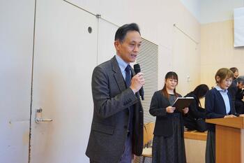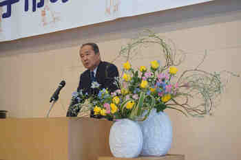 祝辞を述べる丸智彦教育長(演台花:我孫子華道連盟)