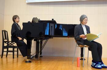 ピアノを演奏する飯田さん、朗読をする上杉さん