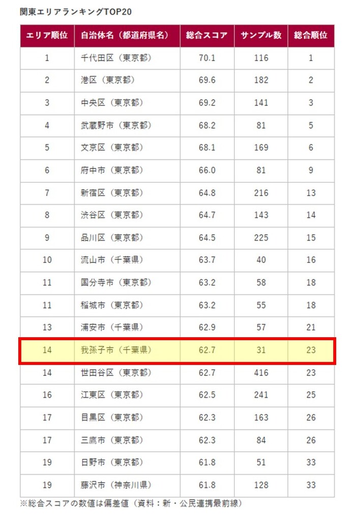 同ランキングにおいて、我孫子市は全国では世田谷区とならび23位、関東エリアでは14位にランクインしました。我孫子市がランクインしたのは、2017年の調査以来初めてです。