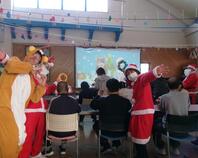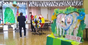 全体活動(食堂にて太鼓ゲームと塗り絵)