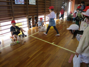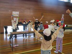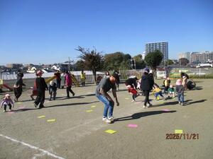 第一小学校の秋祭りに招待され、一年生と年長組が交流をしてきました。どんぐりや松ぼっくりを使った手作りおもちゃでの遊び方を一年生に教わりながら、楽しんできました。