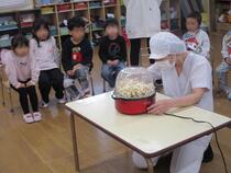 年長組の子どもたちが春にポップコーンの種をまき、夏の暑さにも負けず、一生懸命水やりを頑張った結果、たくさんの実ができました。1,2か月干したあと実をばらし、11月の終わりにポップコーンの試食パーティーを開くことができました。お鍋の中からいい匂いが広がり、ポンポンと弾ける様子に「わあ~」っと歓声が上がりましたよ。塩味とキャラメル味も作り、年下のクラスにもお裾分け。とても楽しいパーティーになりました。