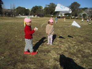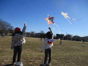 凧あげは毎年、手賀沼公園に行っています。自分で色を塗ったり、絵を描いたりした凧が北風をほどよく受けて揚がると子どもたちも大喜びです。
