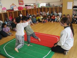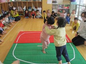 3歳児クラスでお相撲大会を開催しました。お家で練習してきたお子さんもいて、勝ち進むととても嬉しそうな笑顔が見られました。予想外のお友だちが優勝するなど面白い大会になりました。