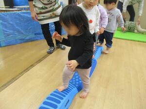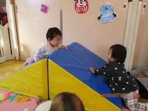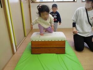 乳児組の運動遊びの様子です。斜面をよじ登ったり、跳び箱からジャンプしたりと室内でも体をしっかり動かしています。順番に行うルールも覚えながら楽しんでいます。