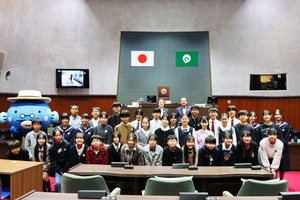子ども議員(市内小学校13校・中学校6校の代表)、市長、教育長ほか関係職員