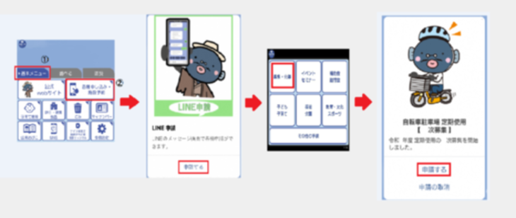 「基本メニュー」→「各種申し込み・施設予約」→「LINE申請」→「募集・公募」→「自転車駐車場定期使用【一次募集】」