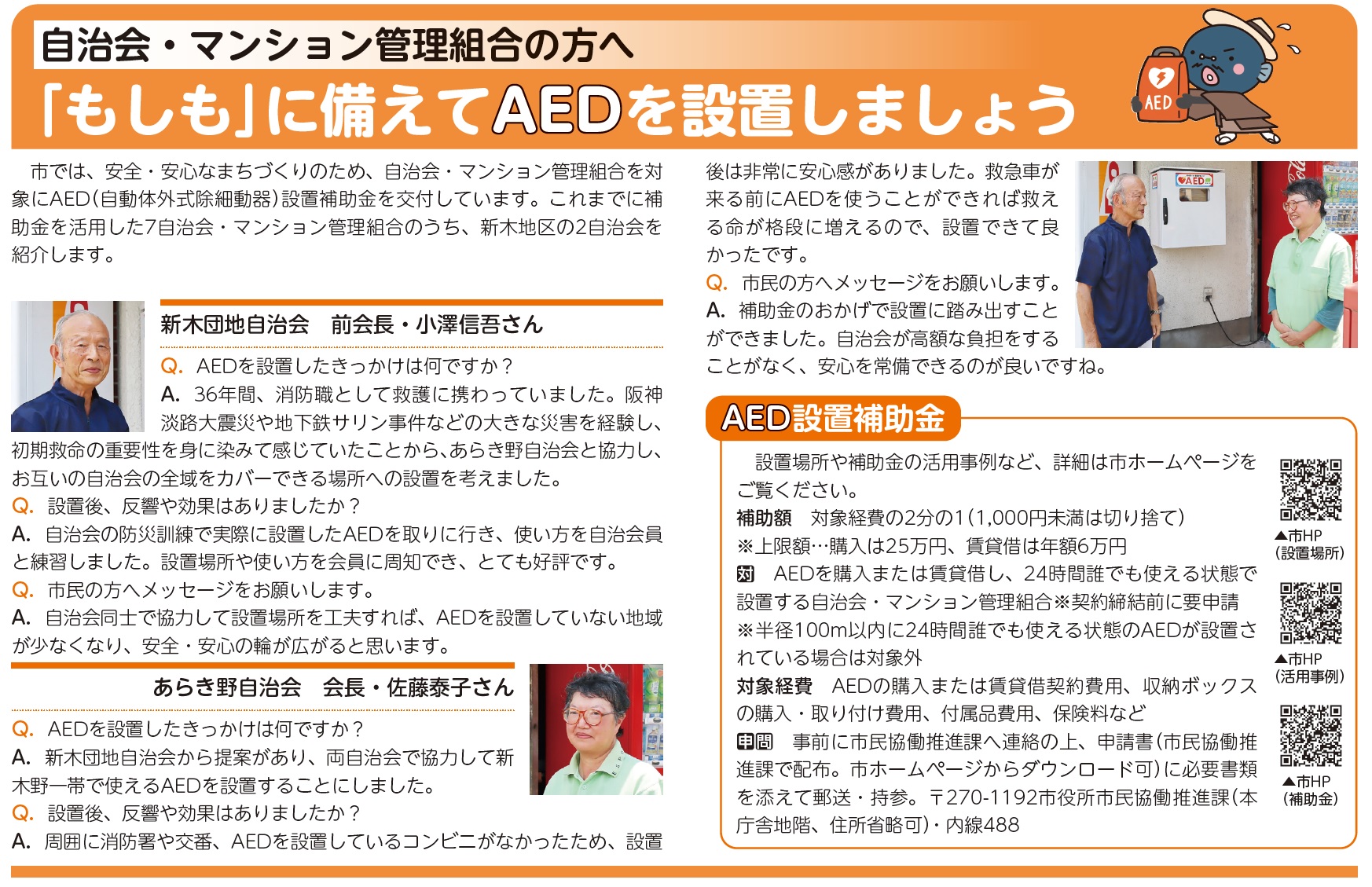 新木団地自治会とあらき野自治会は、両自治会で協力し、AEDの空白地帯を少なくする取り組みを行っています。