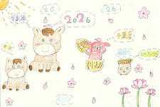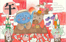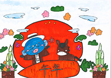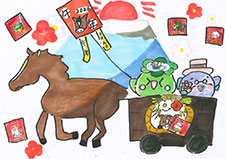 お正月のにぎやかさが作品に現れていますね。干支の動物が並んで歩いている姿は、この先も平和な年が来るように思います。亀がやっこだこを挙げている様子は想像できないアイデアです。新しい発想は嬉しくなります。