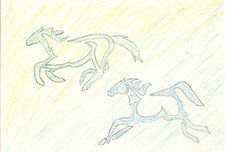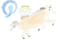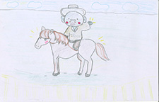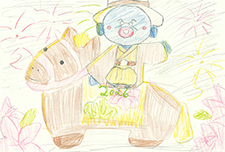 馬のぬいぐるみをしっかり抱いている作者のうれしさが伝わってきます。その瞳が周囲の「緑」を映し出していて、自然への思いも感じます。ニンジンを欲しがるぬいぐるみも可愛く描かれていますよ。