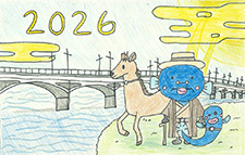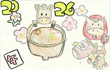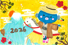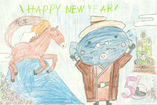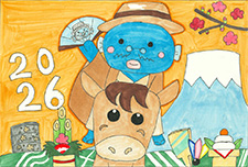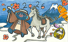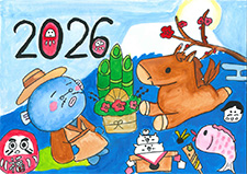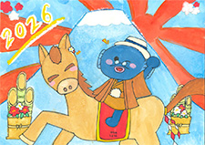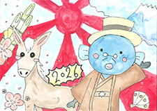 干支の「午」が2026の数字と一体化し、スピード豊かに走り出して、その疾走にうなきちさんも喜んでいるようです。波の上では、元気よく跳んでいる「タイ」の顔が可愛く描けて良かったですね。