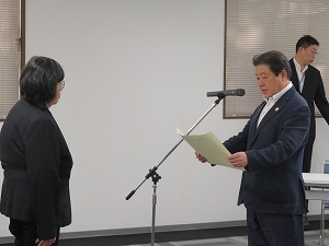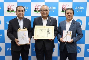 ちば東葛農業協同組合様より、米粉150キロをご寄贈いただき、星野市長から湯原組合長へ感謝状をお渡ししました。