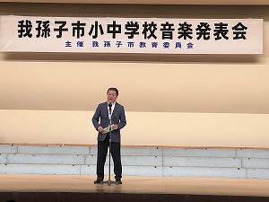 星野市長は、挨拶の中で、今年、34年ぶりに東京で開催された世界陸上において、選手たちの背中を押しているものの一つに「音楽」があると報道されていたことについて触れ、音楽発表会に参加している子どもたちに向け、「皆さんの奏でる音楽にも、ときに仲間を励まし、ときに喜びを分かち合い、自分自身をも勇気づける素敵な力があふれています。発表会に向け磨いてきた技術と、歌や曲にこめられた思い、そして演奏する喜びをこのステージで思いっきり披露してください」と挨拶し、子どもたちの発表を楽しみました。