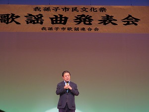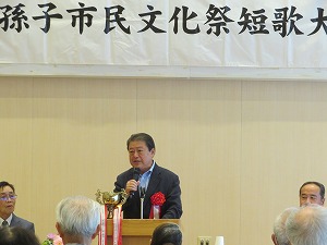 星野市長は、挨拶の中で、市民文化祭開催にご尽力いただいた短歌連盟の皆さん、歌謡曲連合会の皆さんに改めて感謝の気持ちをお伝えしました。