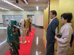 星野市長は、出展者の方から、着物と帯、帯揚げ等の組み合わせなど着物の楽しみ方について丁寧にご説明いただき、時間のゆるすかぎり、観賞しました。
