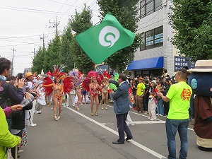 湖北駅南口周辺で開催された湖北サンバ2025に出席しました。星野市長は、サンバパレードのスターターを務め、市章旗を高々と大きく振りました。