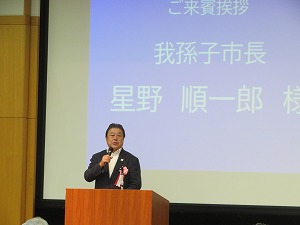 星野市長は、挨拶の中で、市の高齢化率が30%を超えていることに触れ、この講演会が「つながり支え合う地域社会」について考えるよい機会となることを期待していますと挨拶しました。