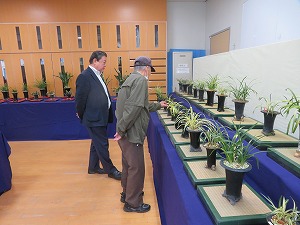 東洋蘭秋季展では、春蘭・山草・柄物が展示され、星野市長は、作品の説明を聴きながら1点1点じっくりと鑑賞しました。