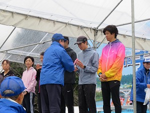 大会会長を務める星野市長は、開会式の挨拶の中で、実行委員会をはじめ参加選手・関係機関の皆様のご尽力に感謝の気持ちを表するとともに、参加されたランナーの皆さんに「美しい手賀沼の自然を感じながら、日頃の練習の成果を存分に発揮し、自己ベストを目指して頑張ってください」と激励しました。また、閉会式ではプレゼンターを務め、入賞者へカップ等を授与しました。